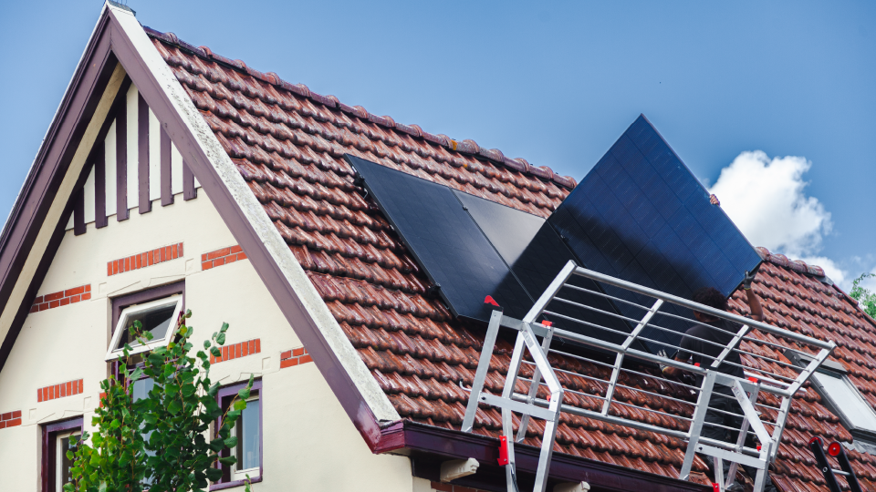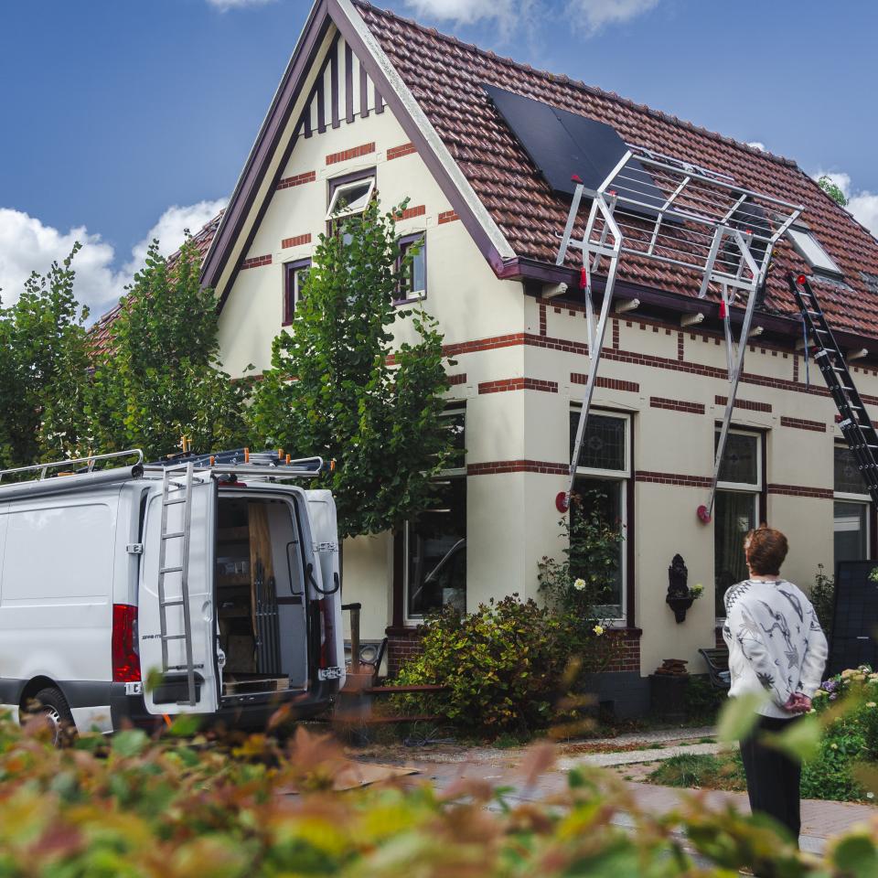 De installateurs plaatsen de zonnepanelen op het dak van het huis van Caren