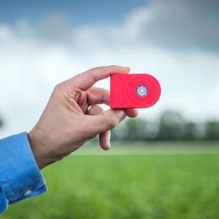 ‘Veel ouderen vinden moderne telefoons te ingewikkeld, te zwaar of te groot’, zegt Van Leeuwen. De nieuwe noodknop is dat in elk geval allemaal niet. Het apparaatje heeft het formaat van een sleutelhanger en met een gewicht van nog geen dertig gram kan het zo in een koordje om de nek. En er zit maar één knop op het fel gekleurde geavanceerd stukje elektronica, precies in het midden.